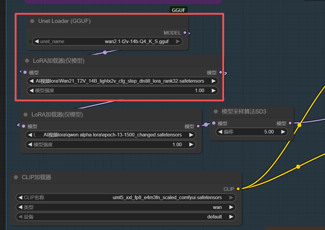 这里我使用了wan2.1 T2V的文生图GGUF Q4模型以及4步加速LORA: