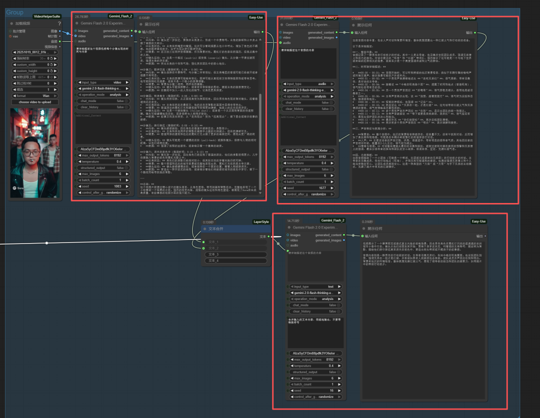 使用它更简单,不用本地作推理,调用免费的API够用,将视频分析结果与音频分析结果进行相加,再经过LLM融合形成新的可用于文生视频的提示词,工作流如下: