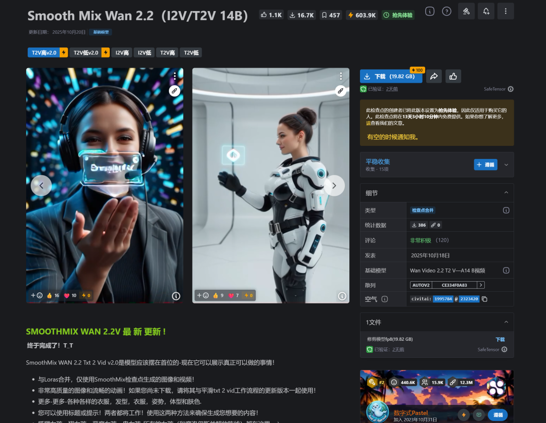 视频生成领域真是百花齐放,此前有介绍过ALL in one的大一统模型,能力很强,但在动态幅度方面稍逊,今天介绍一个基于wan2.2训练出来的文生视频/图生视频模型:smooth mix,动态效果超原生wan2.2,以及优质的美学。生成出来的视频从画质、动态都很优秀。重点是NSFW能力很好很丝滑。