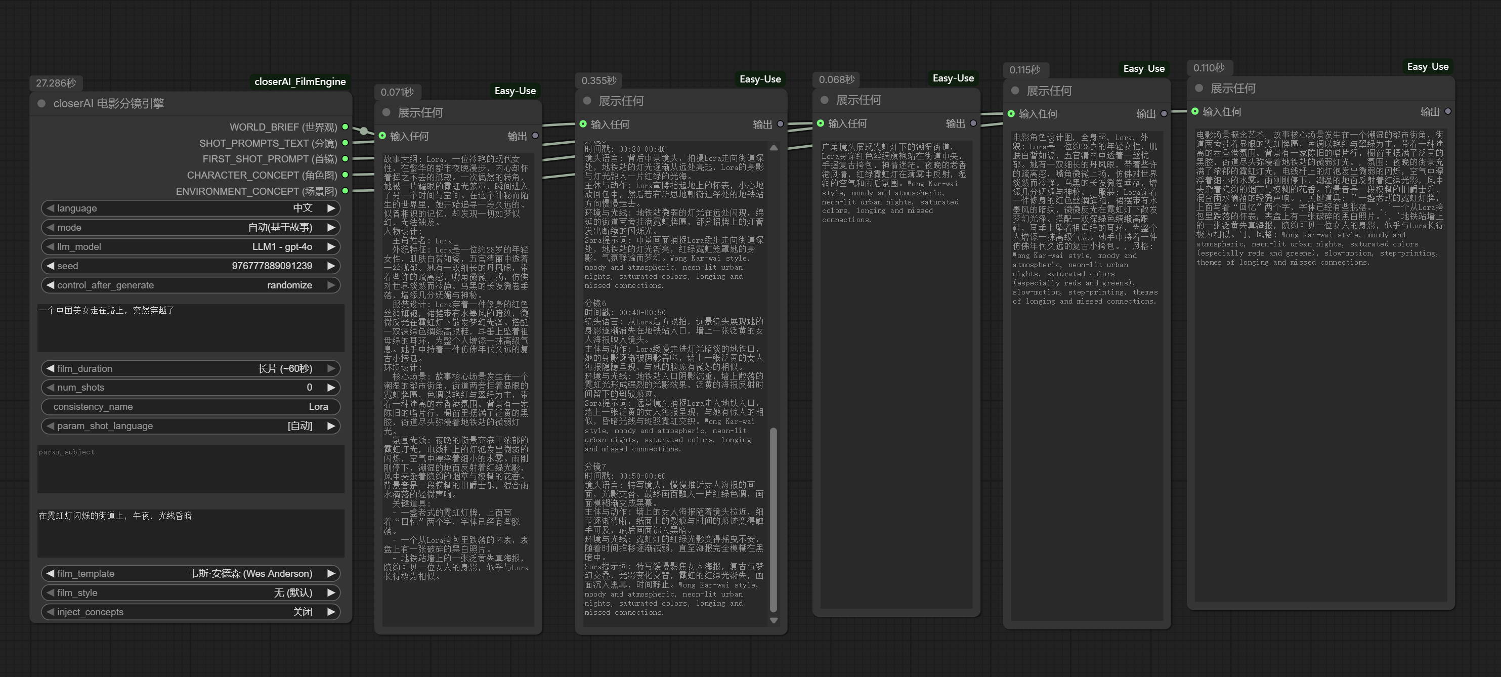 closerAI 电影分镜引擎 是一个为 ComfyUI 设计的自定义节点,旨在自动化电影概念设计和分镜提示词的生成过程。它可以将一个简单的创意想法扩展为一个包含故事大纲、角色设计、场景设计的完整“世界观”,并自动生成一系列结构化的、可用于 AI 视频模型(如 Sora)的分镜提示词。