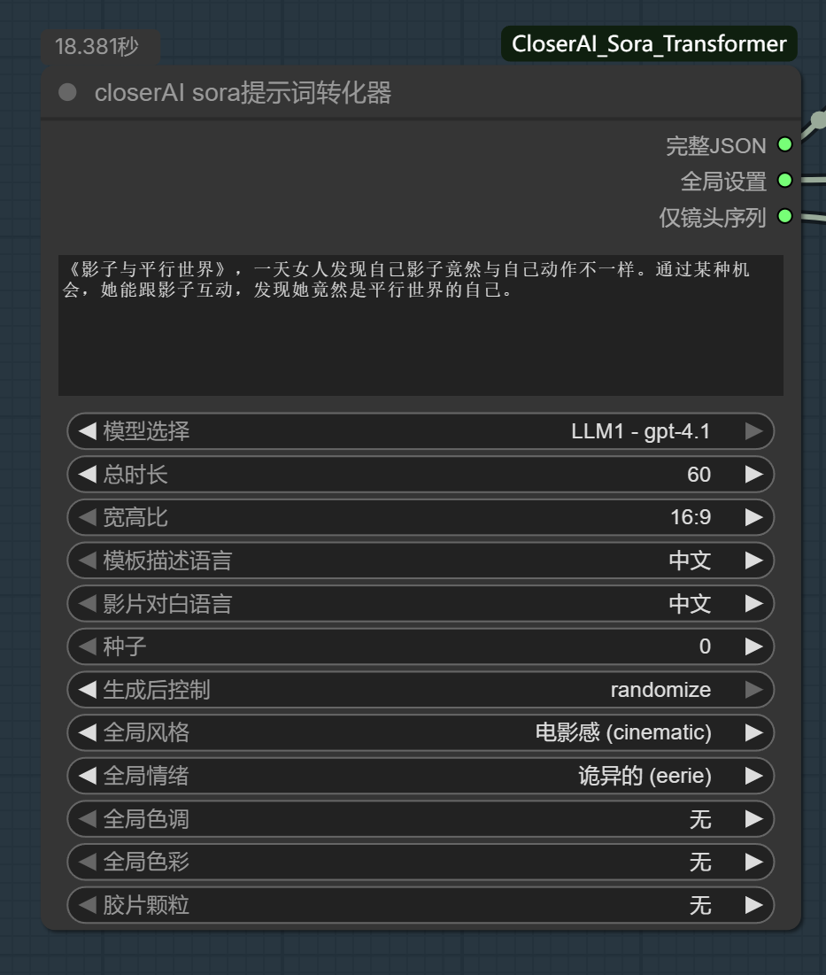 完整JSON:(最重要) 包含global_settings和shot_sequence的原始完整JSON。这是提取器节点的输入源。全局设置:单独提取global_settings部分,方便您在UI上预览检查。仅镜头序列:单独提取shot_sequence数组,包含原始的null值。