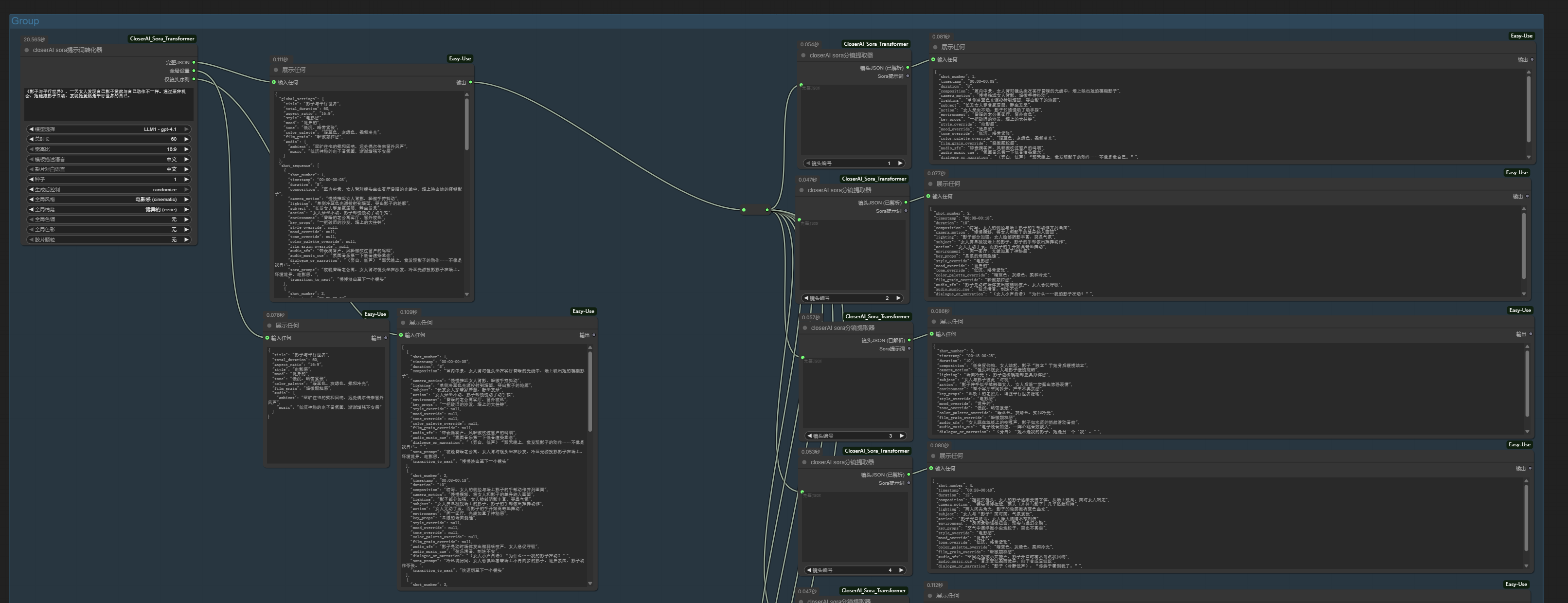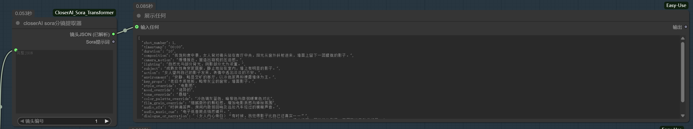 显示文本节点,连接到提取器的Sora提示词或镜头JSON (已解析)输出,以查看结果。 - (在工作流中)将