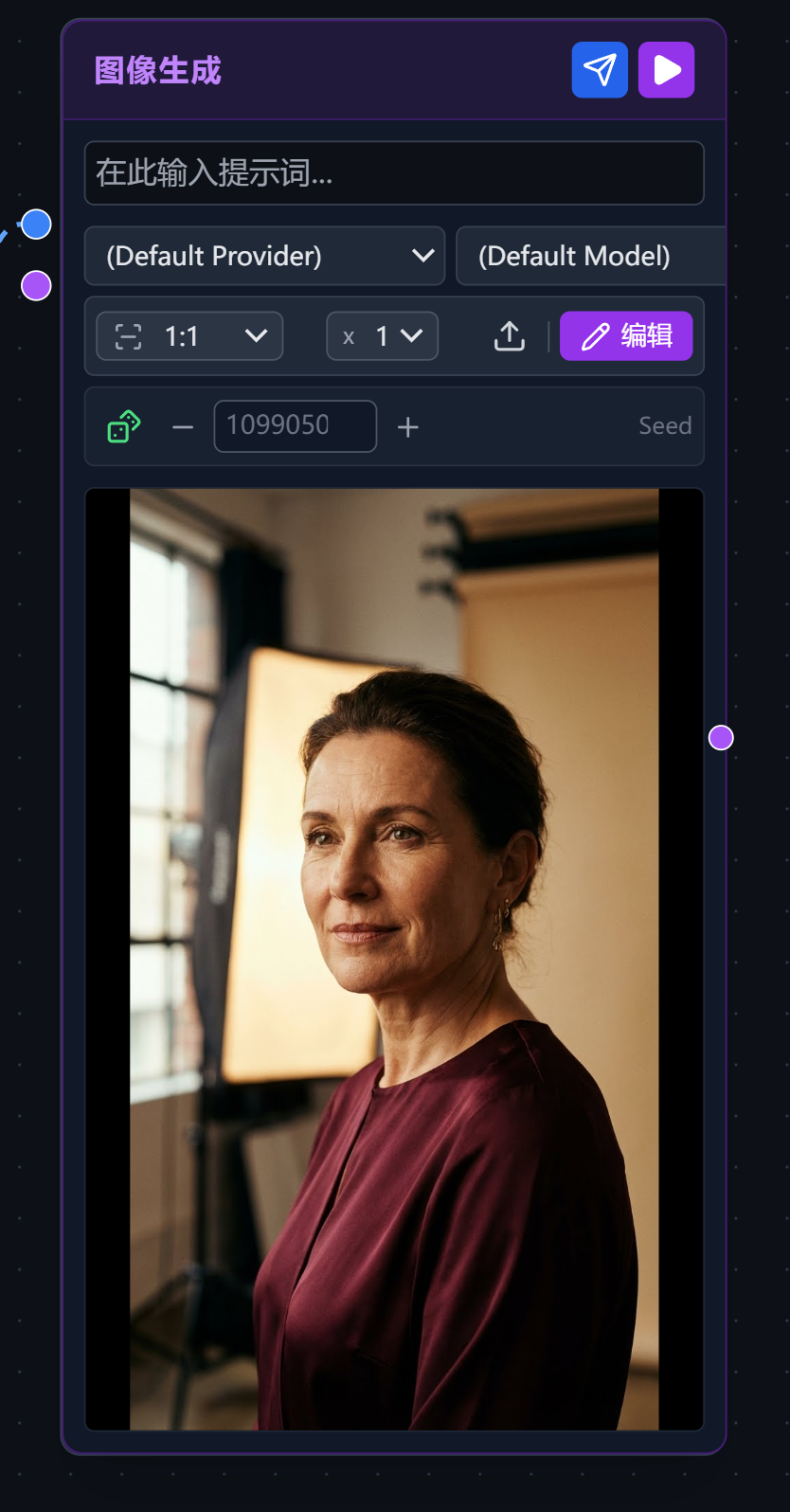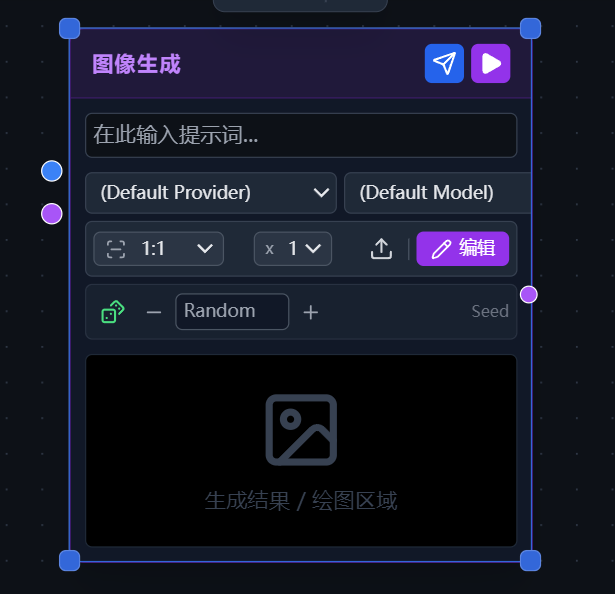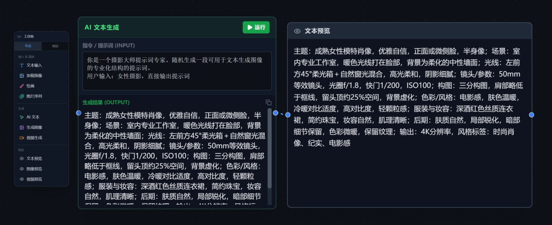 AI生成节点,它就是一个AI助理,所有涉及文本生成的,就通过这个节点来生成。直接输入指令,点击它右上角的运行,单独执行生成。