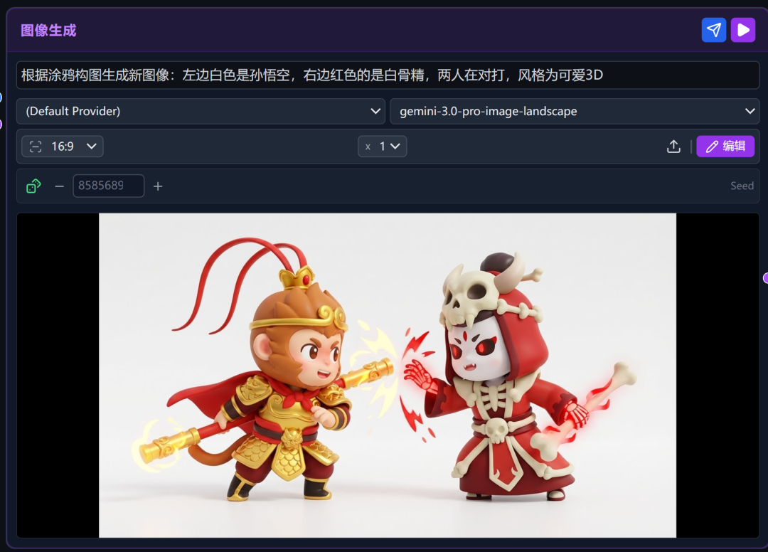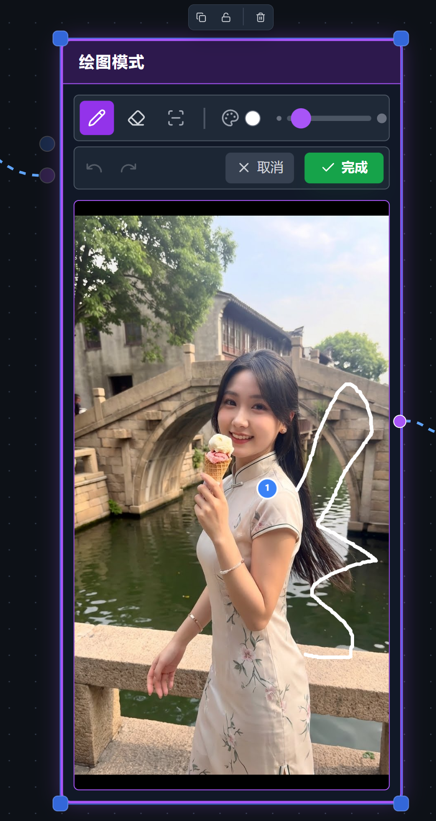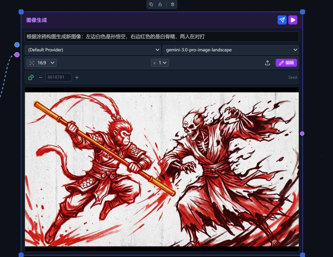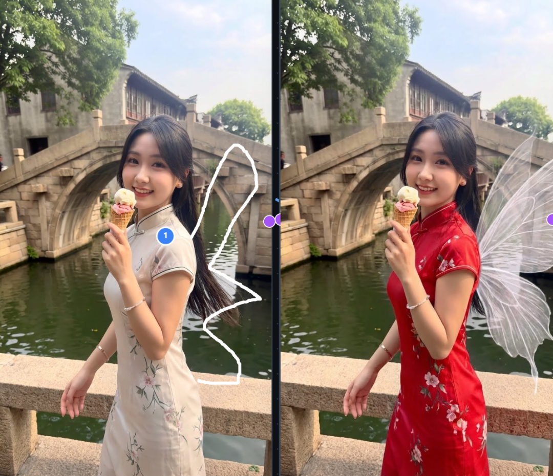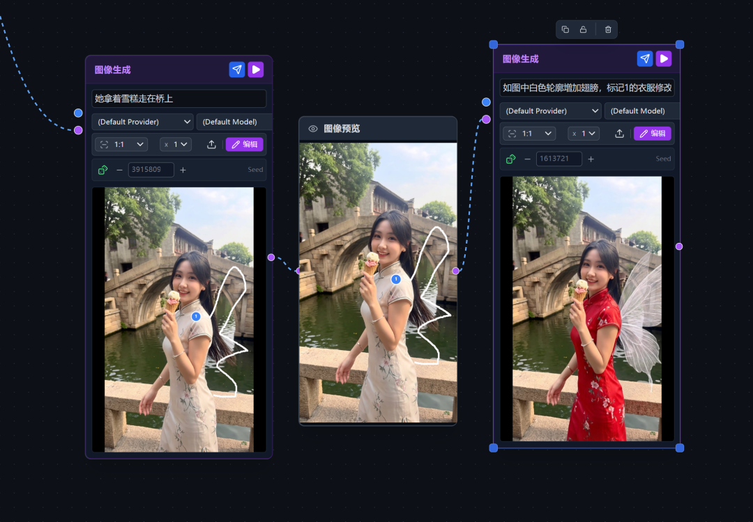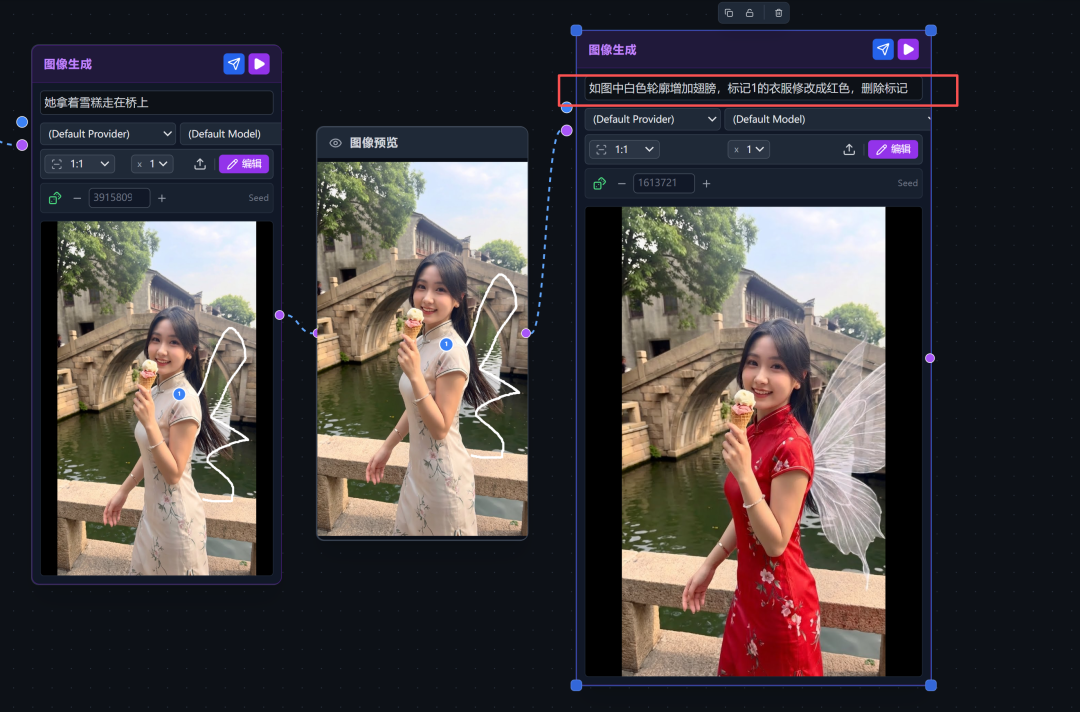 再接入图像生成节点,提示词写:如图中白色轮廓增加翅膀,标记1的衣服修改成红色,删除标记