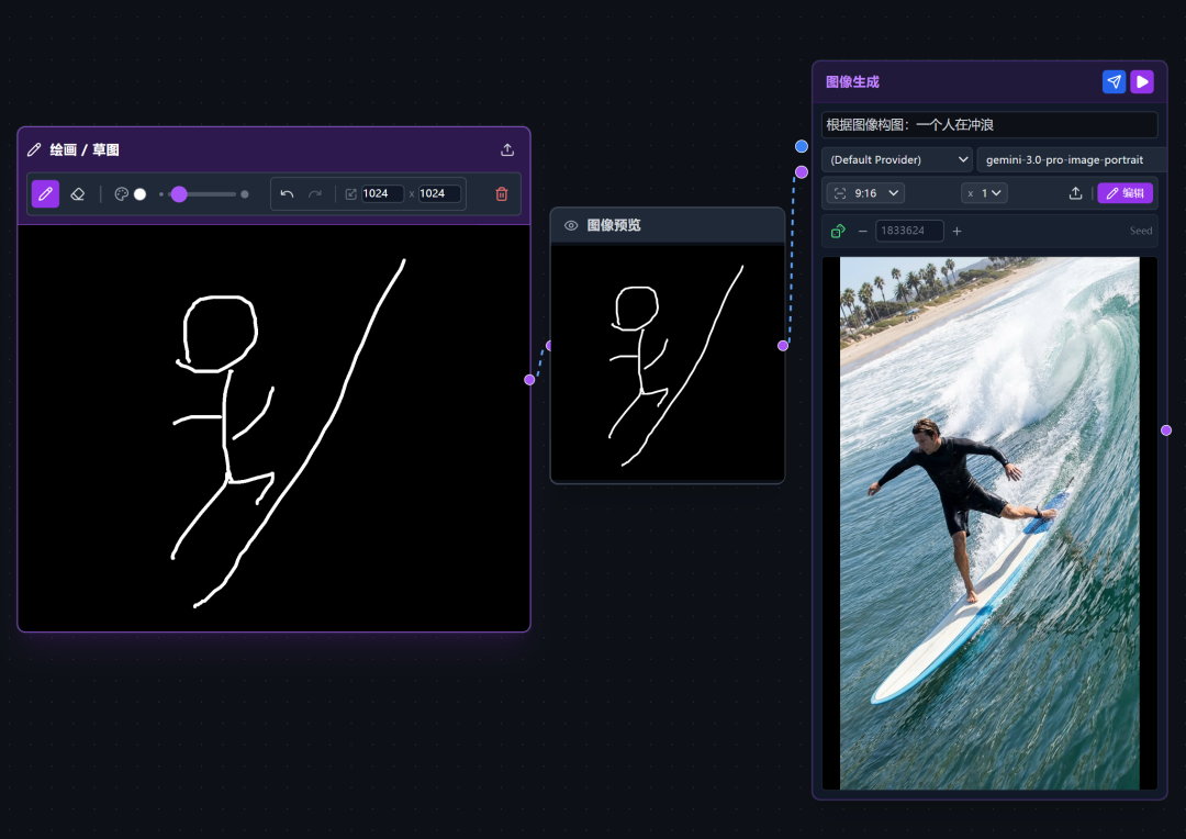 提供了绘画节点,直接画完写提示词生成:根据图像构图:一个人在冲浪