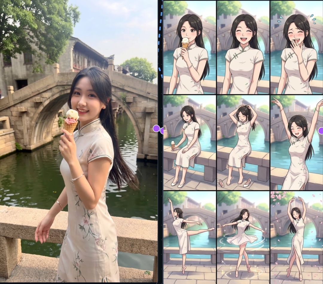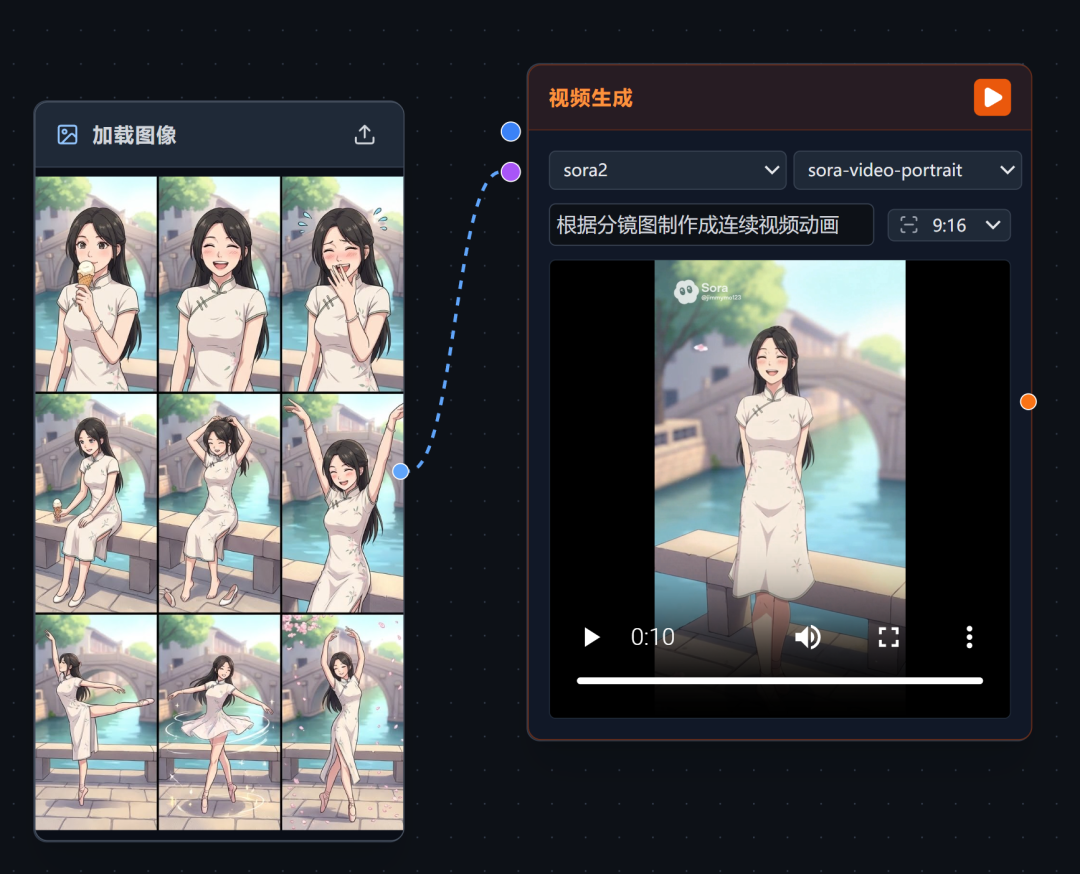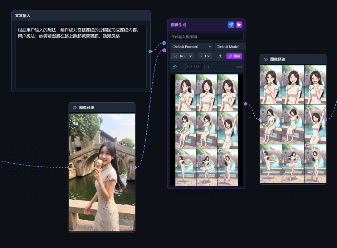 根据用户输入的想法,制作成九宫格连续的分镜图形成连续内容。