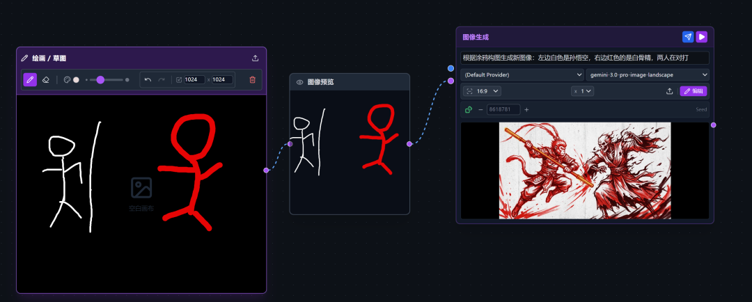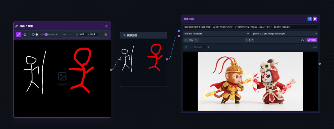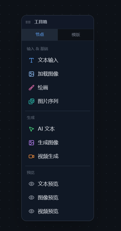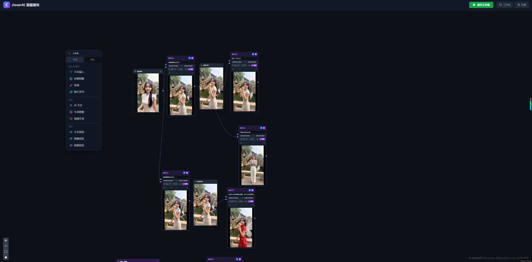 它类似comfyUI的节点式工作流。但它并不依赖本地设备,而是通过API来实现所有形态的内容生成:它具备文本生成、图像生成、图生图、图像编辑、涂鸦生图、文生视频、图生视频的功能。