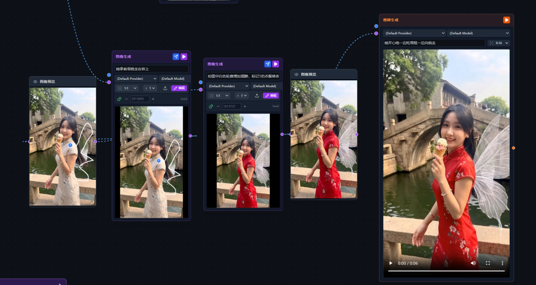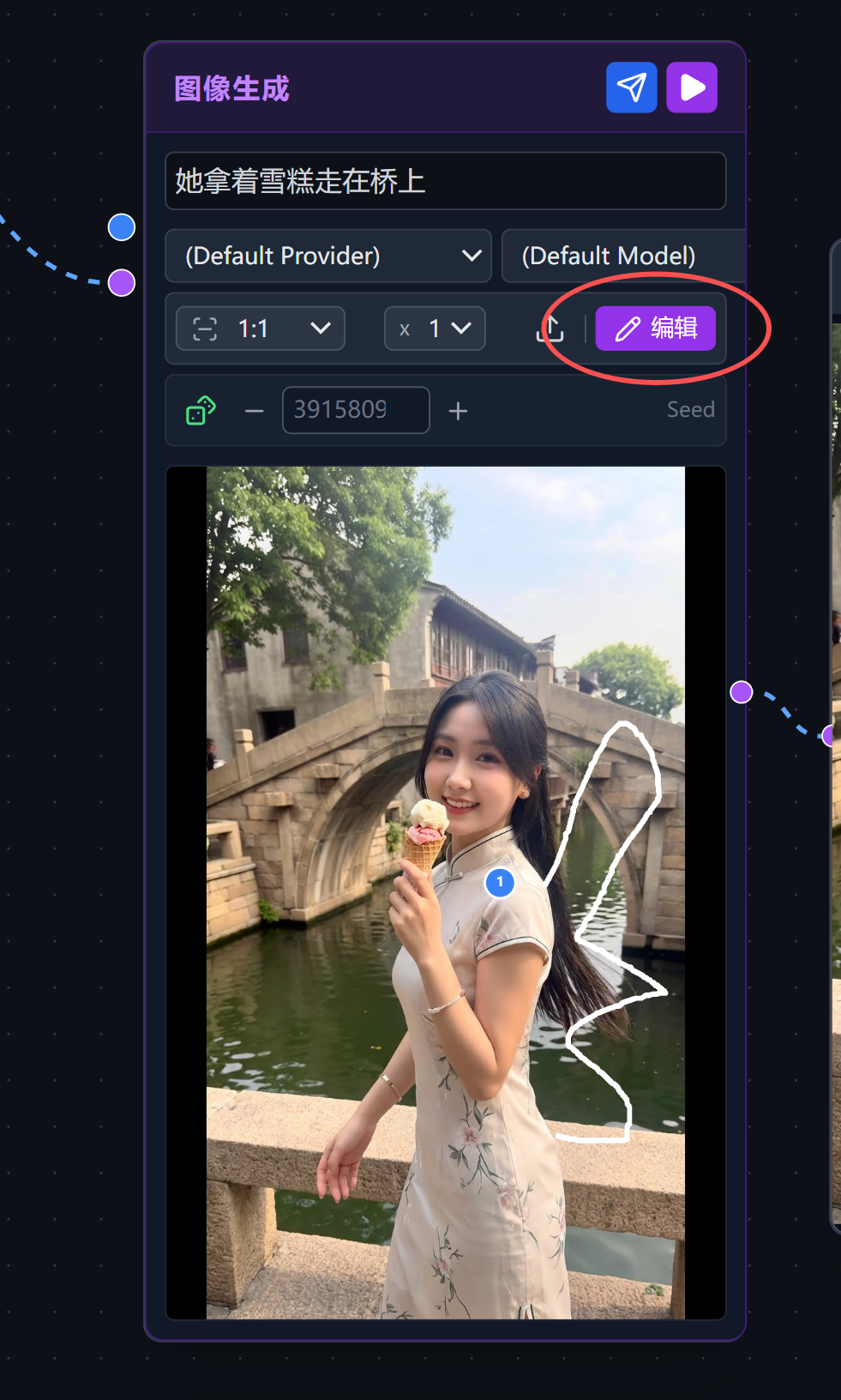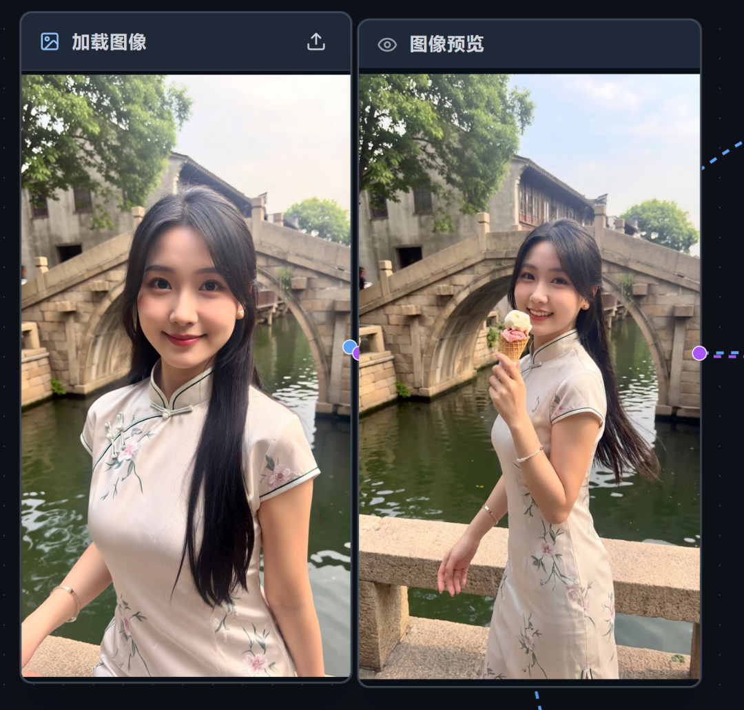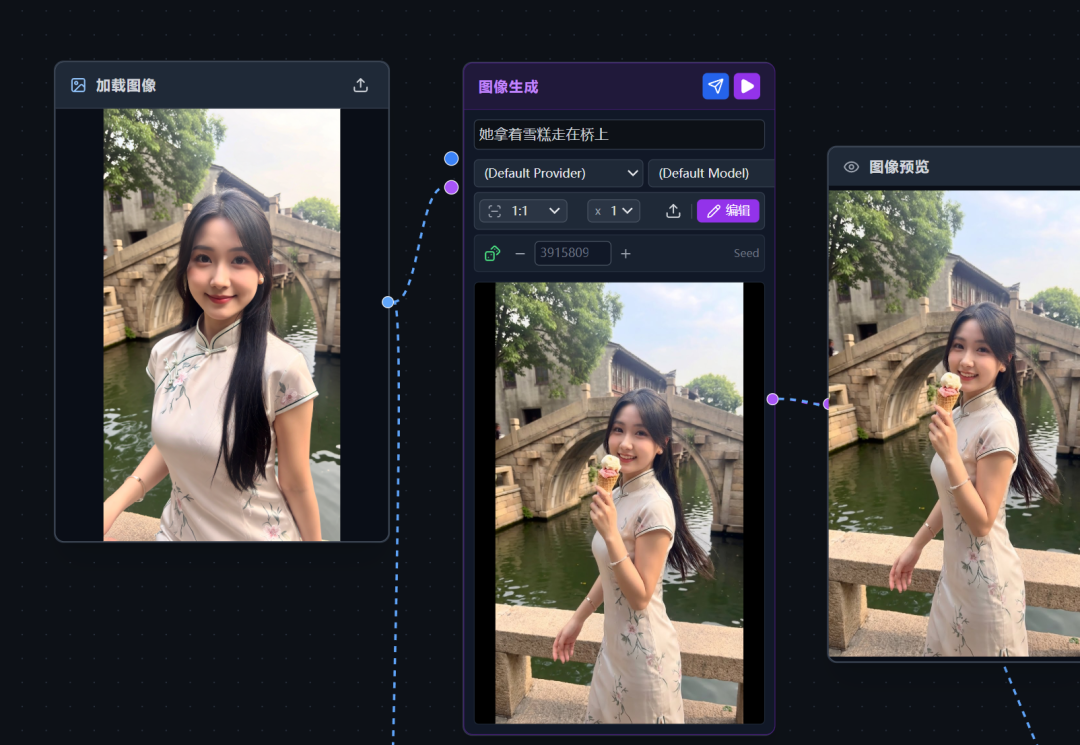 加载一张图接入图像生成节点,提示词写:她拿着雪糕走在桥上