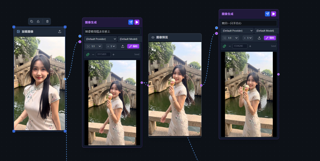 连续图像编辑:在其后面再接入图像生成节点,提示词写:她另一只手比心