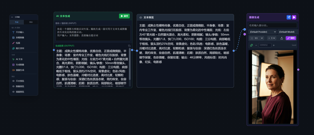这样的自由流程画布,基于NanoBananaPro基本涵盖所有想要做的效果和应用,像我们之前谈到的NanoBananaPro的案例都能生产。同时接入目前最强的两个视频生成模型,一个这样的工具应对各种使用场景。