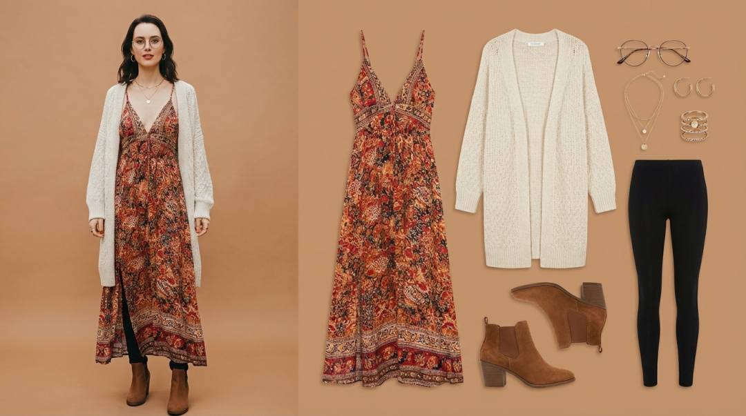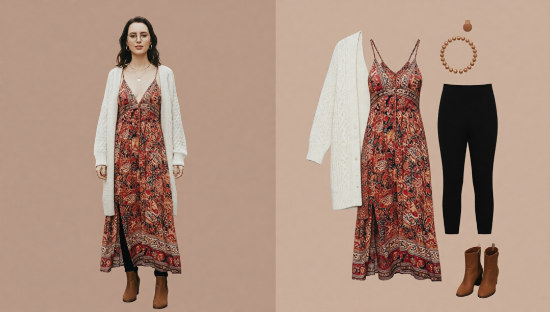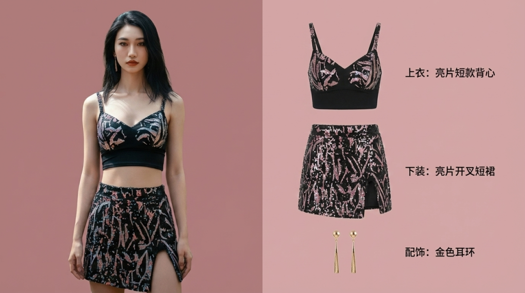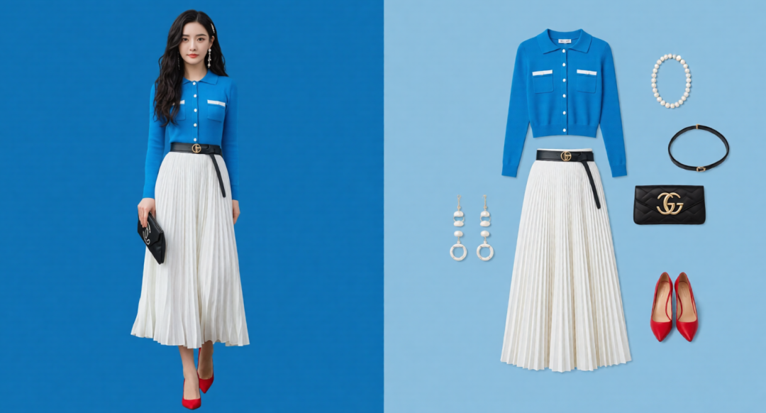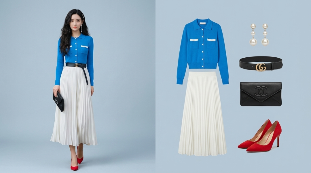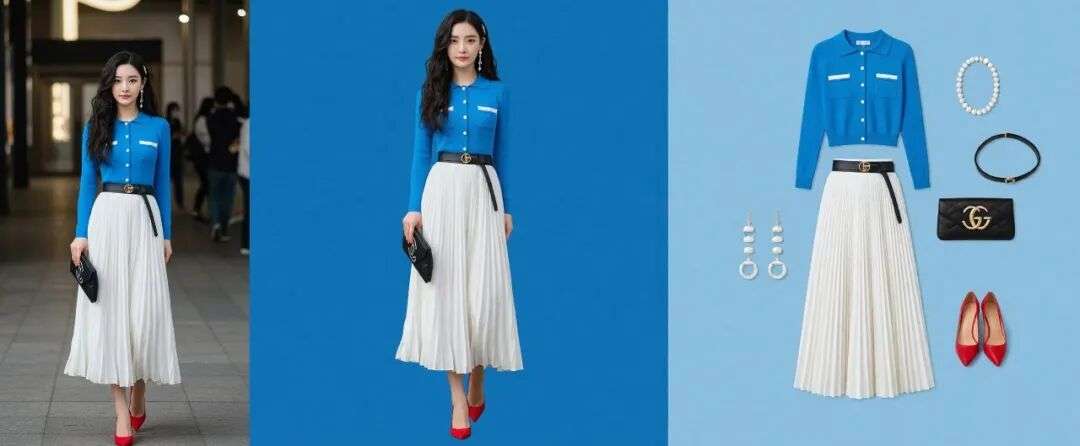 根据图片中人物穿搭进行穿搭和配饰拆解,纯色背景的色系要与衣物色系一致的,保持人脸特征要保持一致,左侧为人物ootd形象,右侧为穿搭的展示。