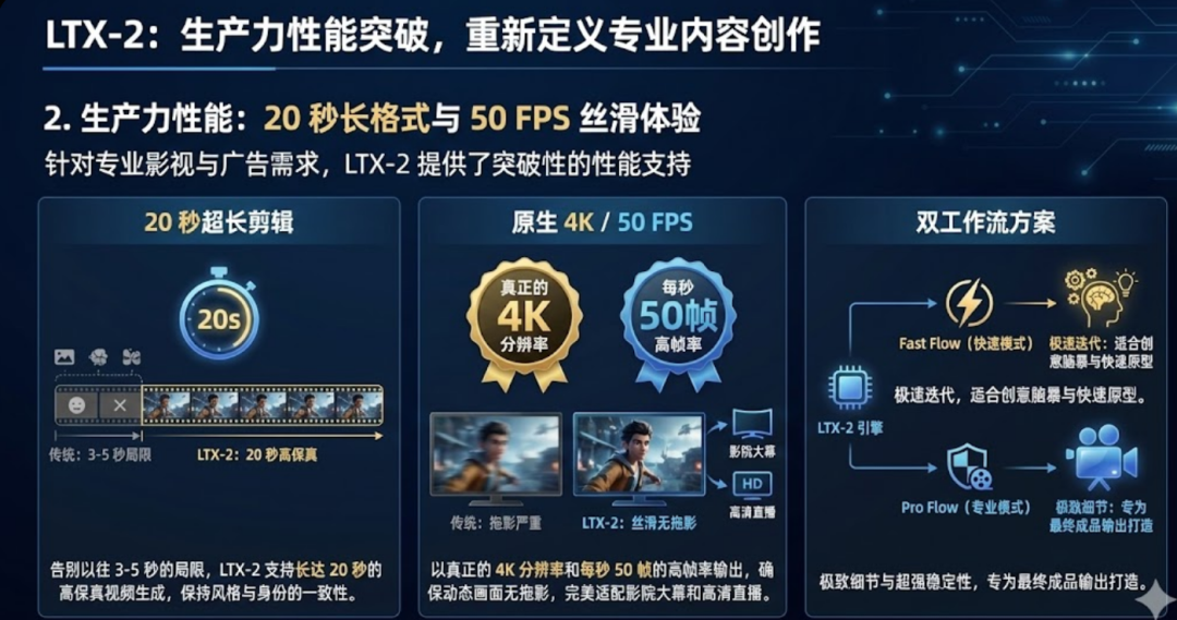 针对专业影视与广告需求,LTX-2 提供了突破性的性能支持: