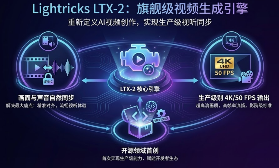 近日,Lightricks 正式推出了其旗舰级视频生成模型 LTX-2。这不仅是一个技术升级,更是一个完整的影音生产引擎。它解决了 AI 视频创作中最大的痛点:画面与声音的自然同步,并首次在开源领域实现了生产级别的 4K/50 FPS 输出。
