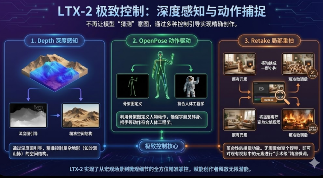 LTX-2 不再让模型“猜测”你的意图,而是通过多种控制引导实现精确创作: