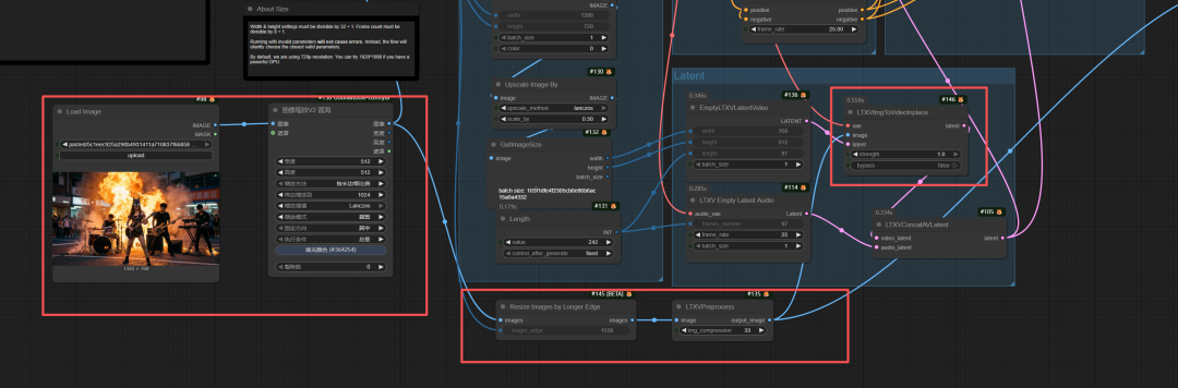 图生视频工作流是在文生视频基础上作一些小小修改,接入图像并进行图像尺寸处理,然后接入LTXVImgToVideoInplace节点中。其它一样。