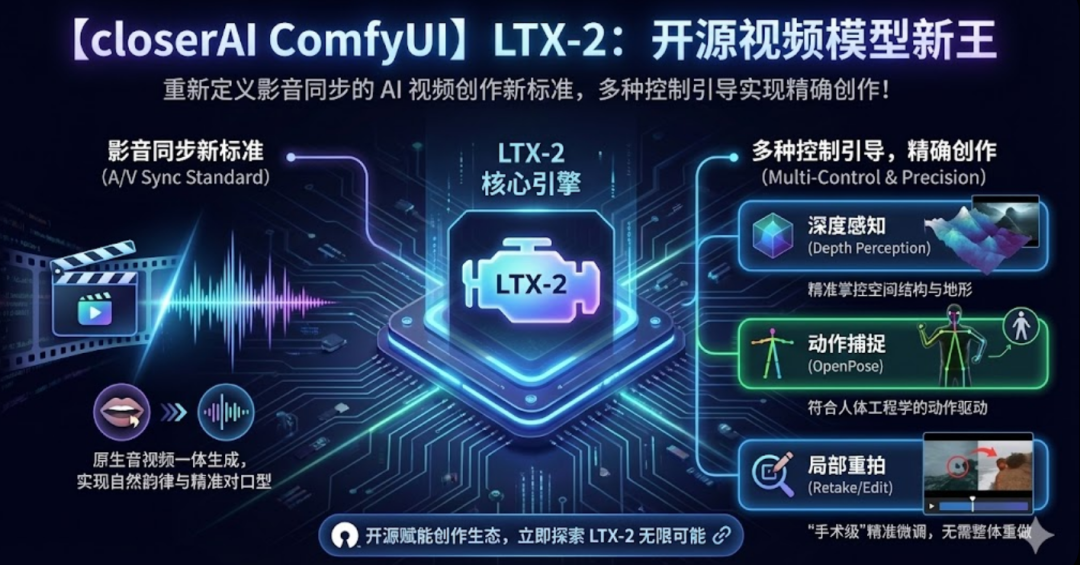 【closerAI ComfyUI】开源视频模型新王:LTX-2,重新定义影音同步的 AI 视频创作新标准,多种控制引导实现精确创作!