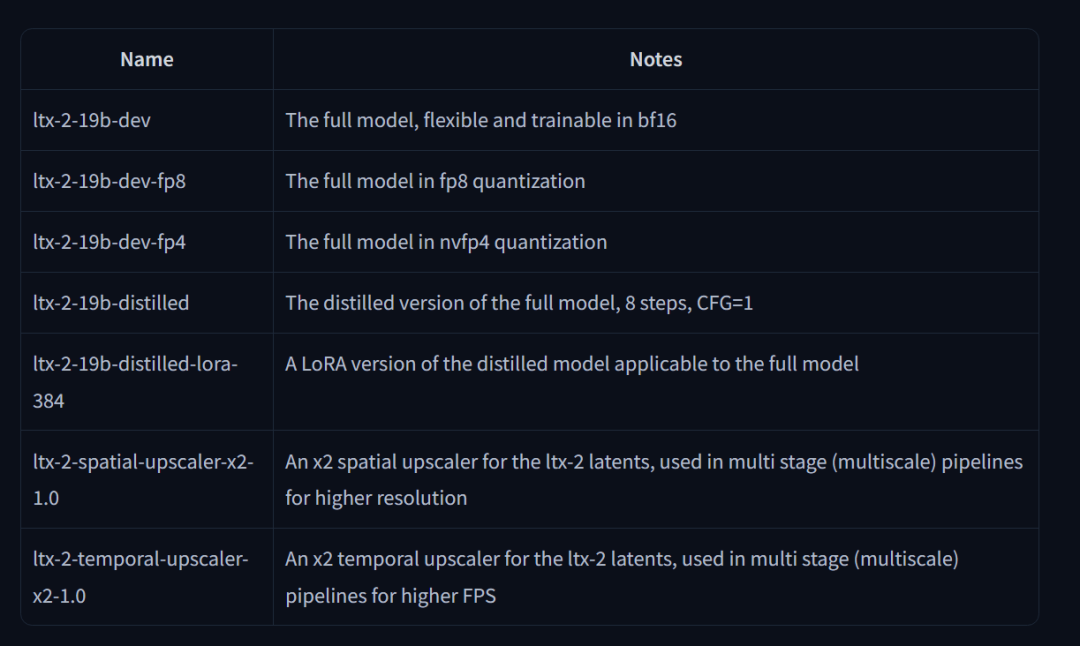 - LTX-2-19b-dev: 190亿参数的开发版,支持 bf16、fp8 和 nvfp4 量化,适合微调。