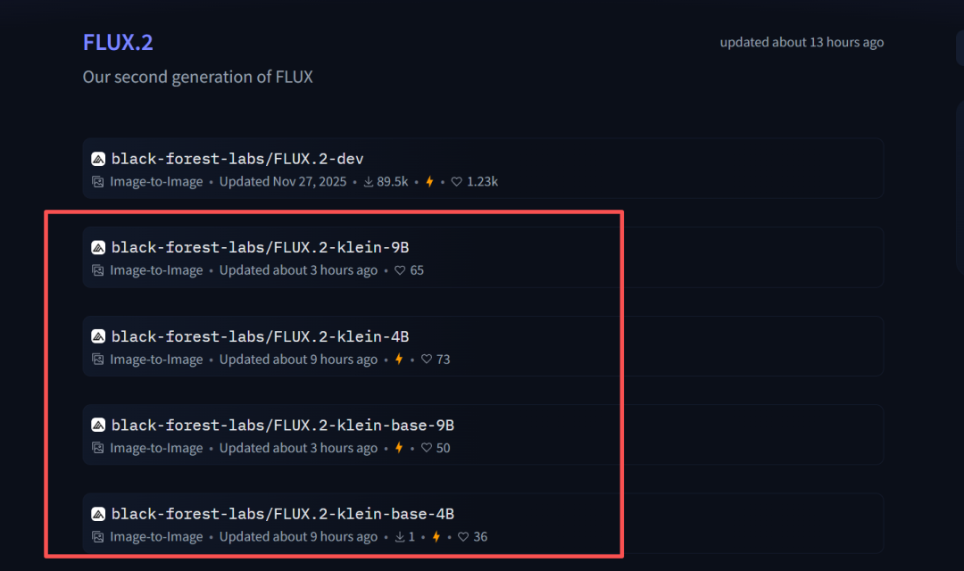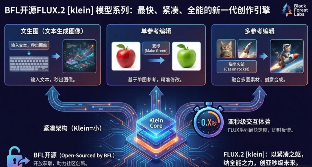 这不,就在今天黑森森图队Black Forest Labs (BFL) 开源了FLUX.2 [klein] 家族模型,作为 FLUX 系列中目前最快的模型,“Klein”(德语意为“小”)通过紧凑的架构将文生图、单参考编辑及多参考编辑功能高度统一,实现了前所未有的亚秒级(Sub-second)交互体验。