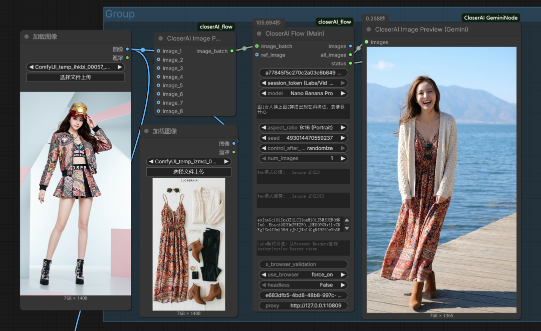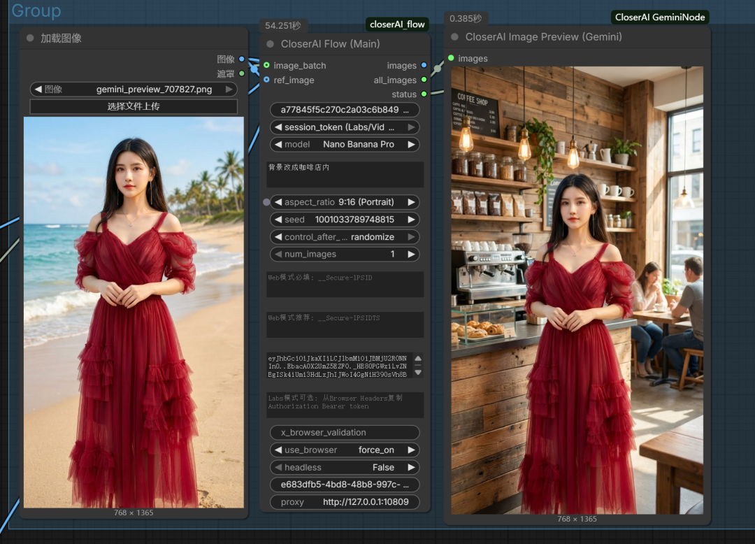 这里我也拿NanoBananaPro对比了下:这是我最新优化的closerAI flow节点,这次突破的验证的难题,终于跑通了,理论上你有PRO账号就能免费无限地使用NanoBananaPro: