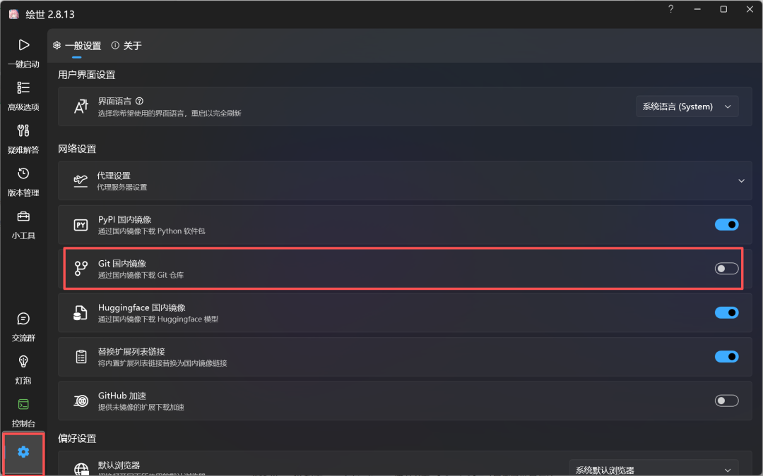 这是如果大家使用的是秋叶整合包,会发现它开发版本停止在1月6日。大家打开秋叶包,在设置中关闭git国内镜像,然后刷新列表就行了。