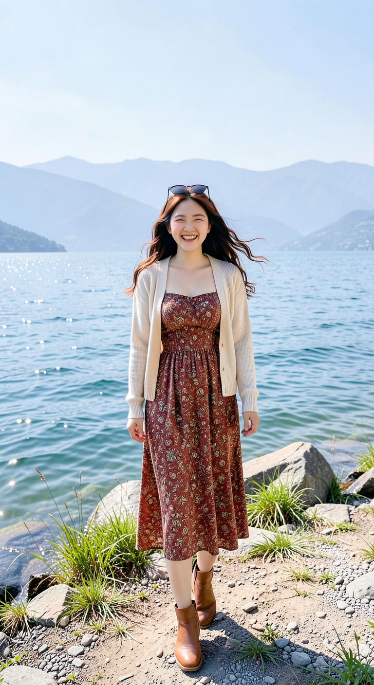 超高清照片,最好的质量,一位年轻漂亮的东亚女性,留着长卷发,头顶别着墨镜,穿着浅米色针织开衫,内搭红棕色复古花纹吊带长裙,脚穿棕色短靴,露出牙齿灿烂大笑,站在湖边的岩石滩上(有零星绿草),背景是宽阔的蓝色湖水(水面有阳光波光),远处是淡蓝色的连绵山峦,天空晴朗呈浅蓝色,微风吹动头发,明亮的自然日光,悠闲愉悦的度假氛围,色彩温暖明快,细节清晰锐利