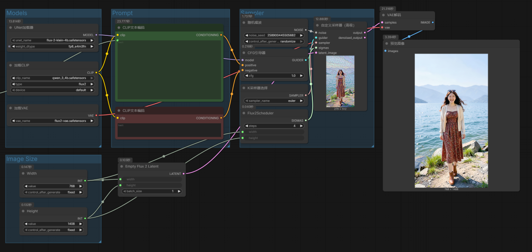 FLUX.2 [klein] 的部署非常直观,支持原生的节点流。更新下comfyUI最新版本。