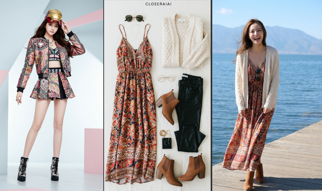 输入两张图,一张人物,一张服饰,提示词:图1女人换上图2穿搭出现在洱海边,表情很开心。