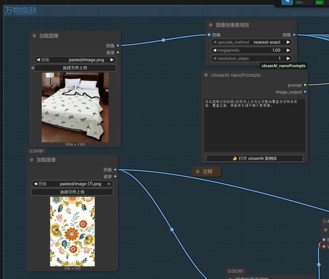 工作流中图案提取是单图编辑的基础工作流,万物换肤是多图编辑的flux2klein工作流。
