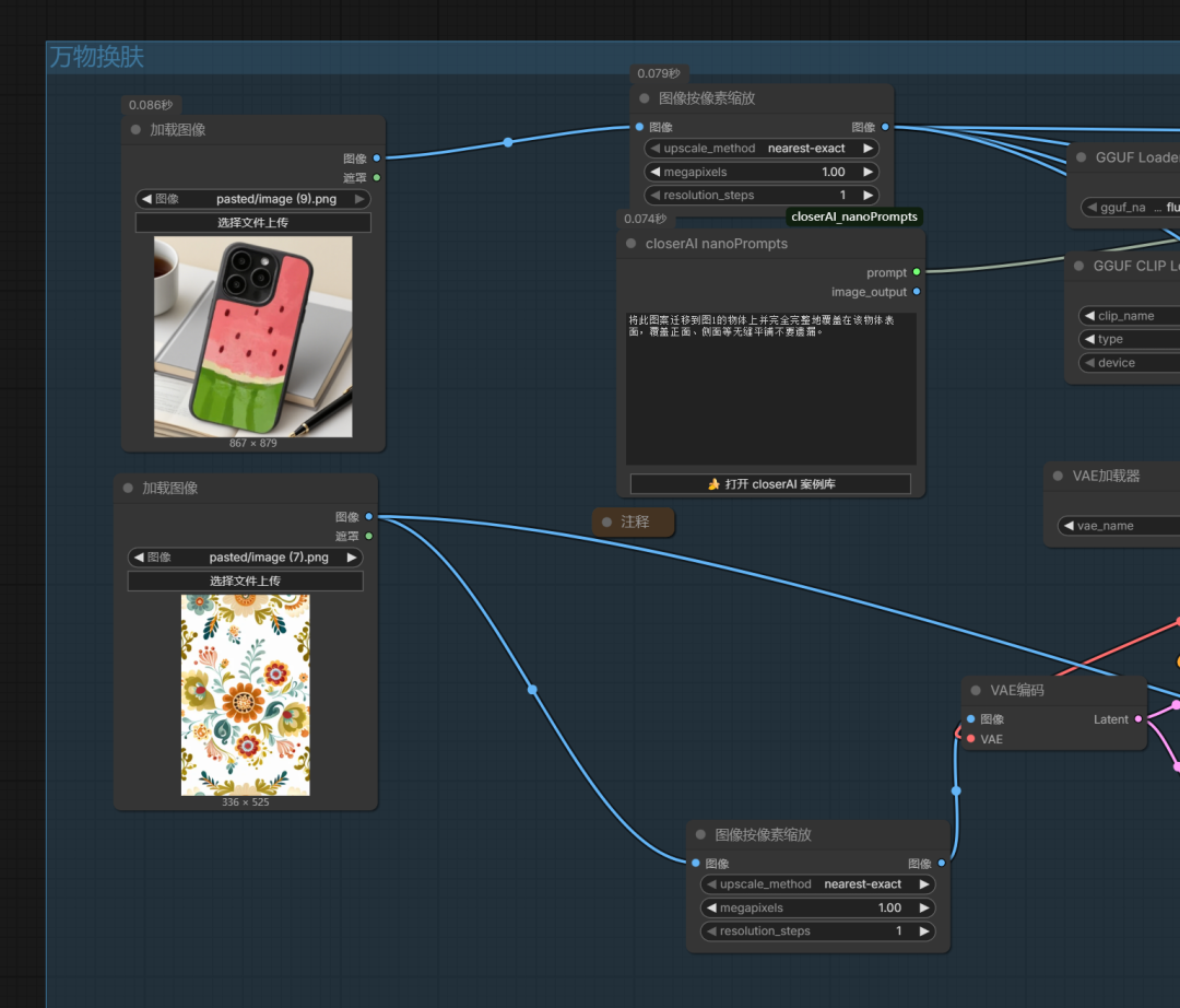 具体closerAI flux2klein图案印花取提与万物换肤工作流如下: