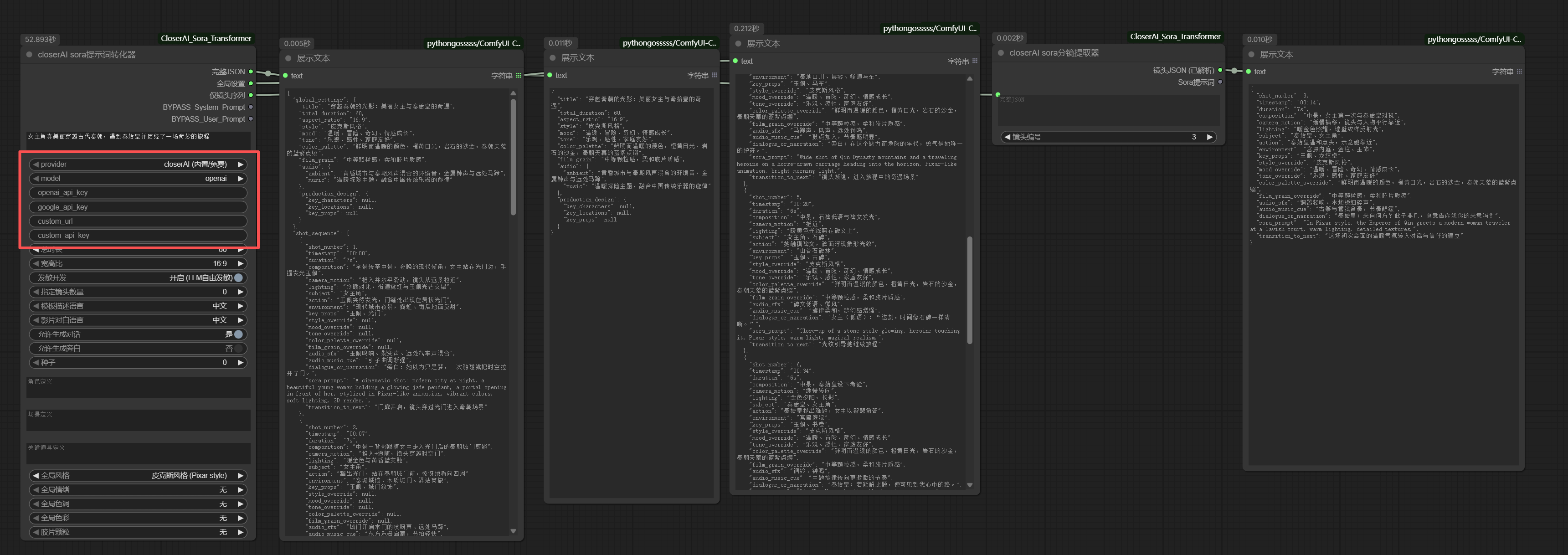 CloserAI Sora 提示词转化器 是一个为 ComfyUI 设计的高级节点套件,旨在将用户输入的简单创意(如“一只猫在赛博朋克城市”)自动“导演化”,扩展为一个完整、专业、多镜头的视频分镜脚本。本节点需要魔法使用哦。内置LLM,不需要你填API,但需要魔法