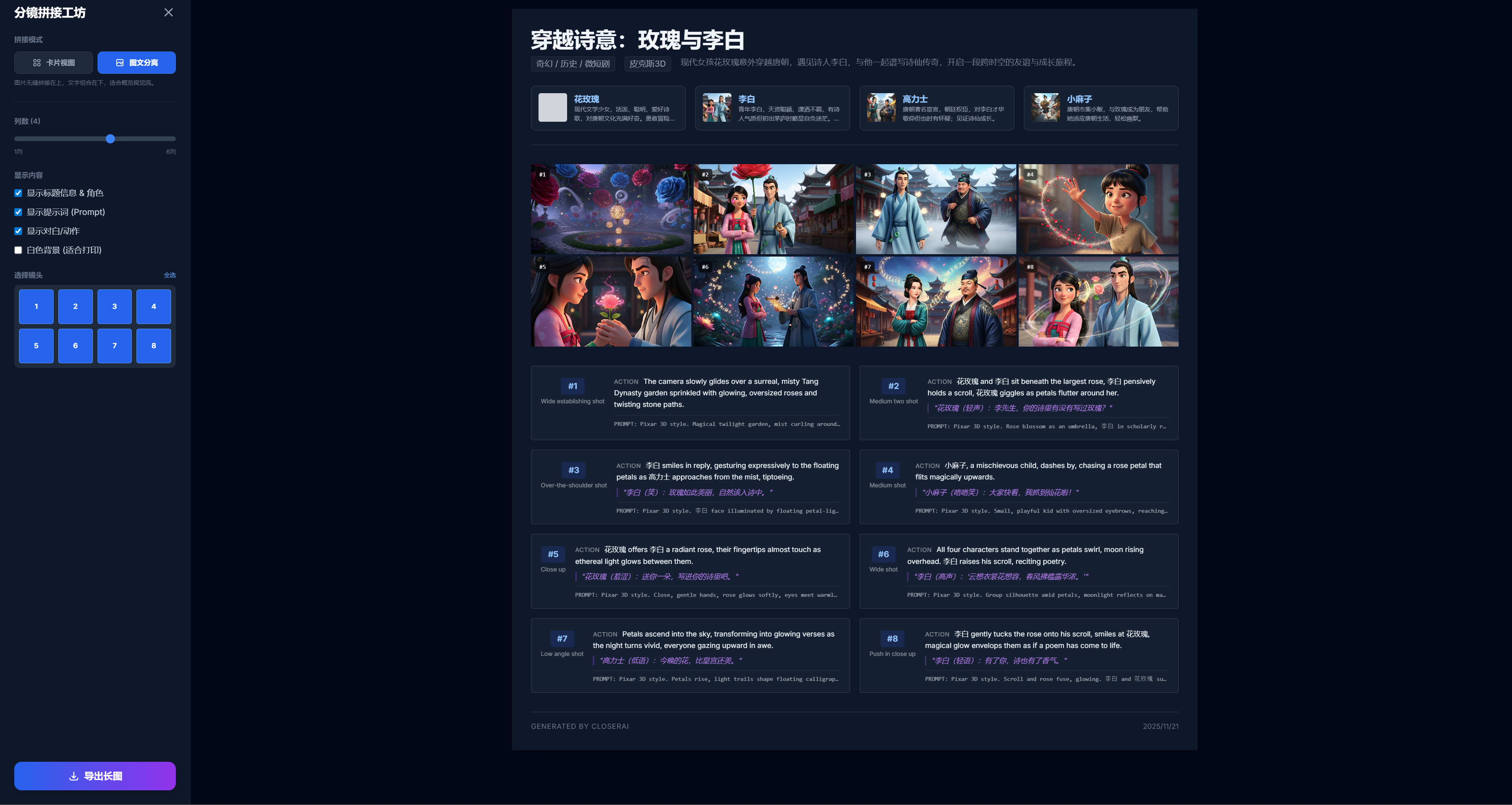 CloserAI 分镜设计 是一款智能化的 AI 辅助创作工具,旨在帮助导演、编剧和创作者快速将一个简单的创意转化为完整的影视策划方案。