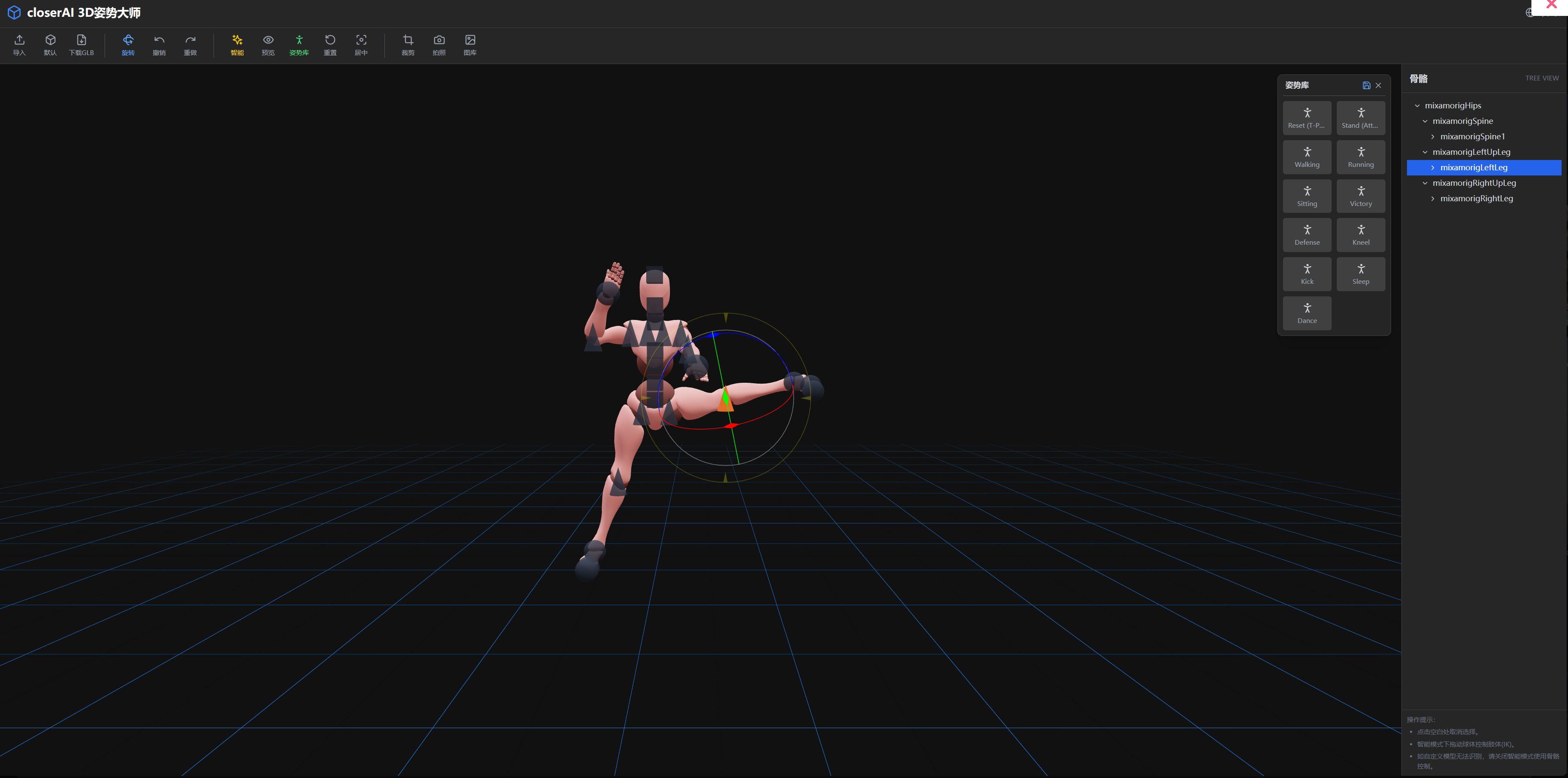 - 🧠 智能记忆 (Auto-Save):独家的状态记忆功能。关闭窗口后自动保存当前骨骼数据,下次打开自动恢复,方便反复微调。