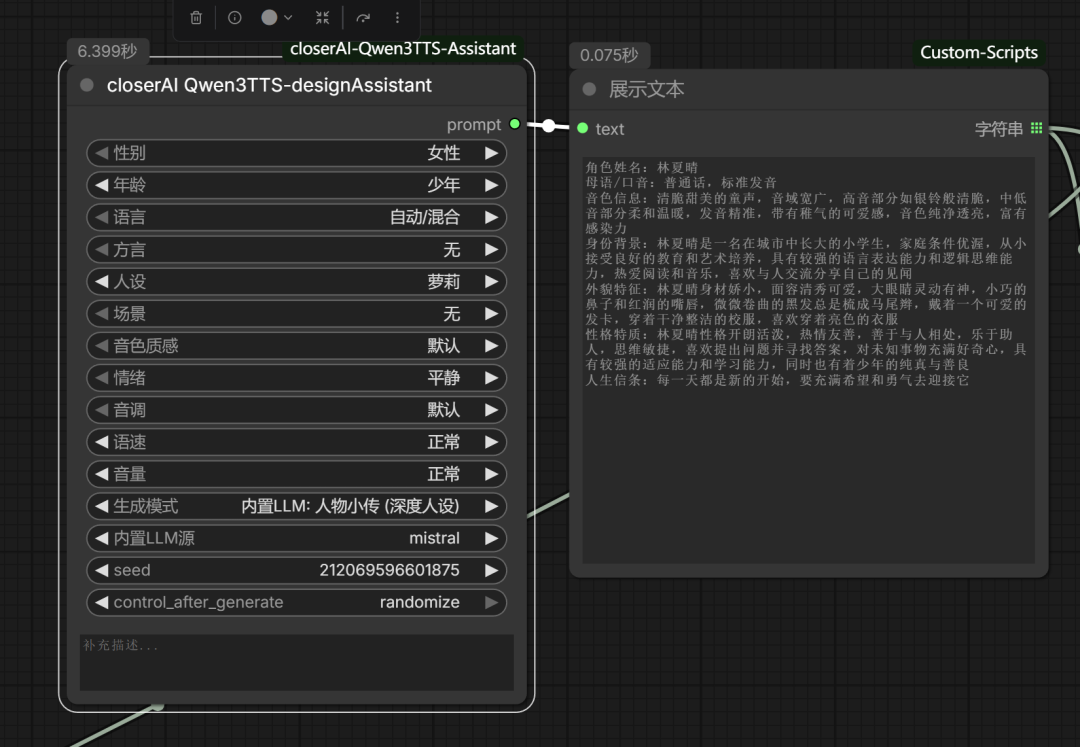 除了交互式录音功能,在Qwen3TTS中,特别为声音设计开发了一个参数与智能提示词的节点,用于声音设计提示词的撰写: