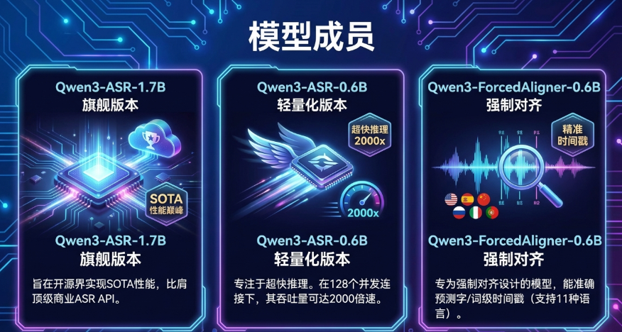 - Qwen3-ASR-1.7B:旗舰版本,旨在达到开源界的 SOTA(州级)性能,并能与顶尖的商业 ASR API 竞争。
