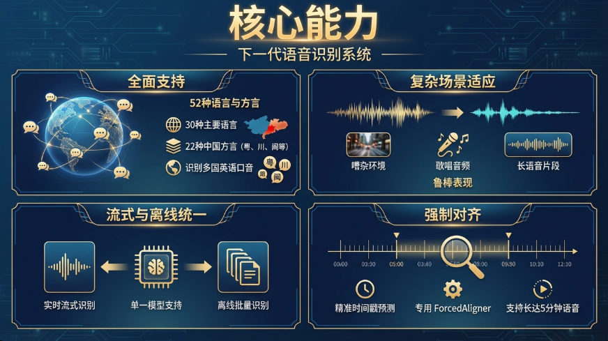 - 强制对齐:通过专门的 ForcedAligner,支持长达 5 分钟语音的精准时间戳预测。