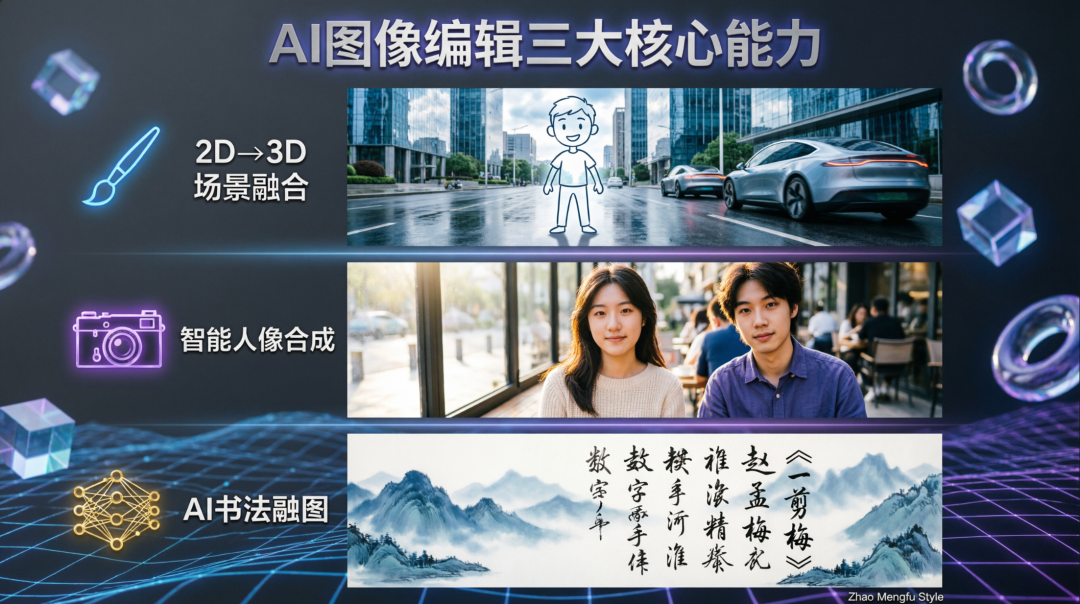 - 跨次元合影: 它可以将 2D 卡通形象完美融入 3D 真实街景。