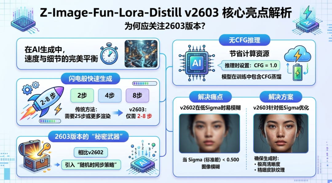 但在本地设备运行时生成时间有点久,如果你还在为等待 Z-Image 缓慢的渲染进度而抓狂,那么阿里巴巴 PAI 团队最近更新的 Z-Image-Fun-Lora-Distill (2603版本) 绝对是你的“救命稻草”。