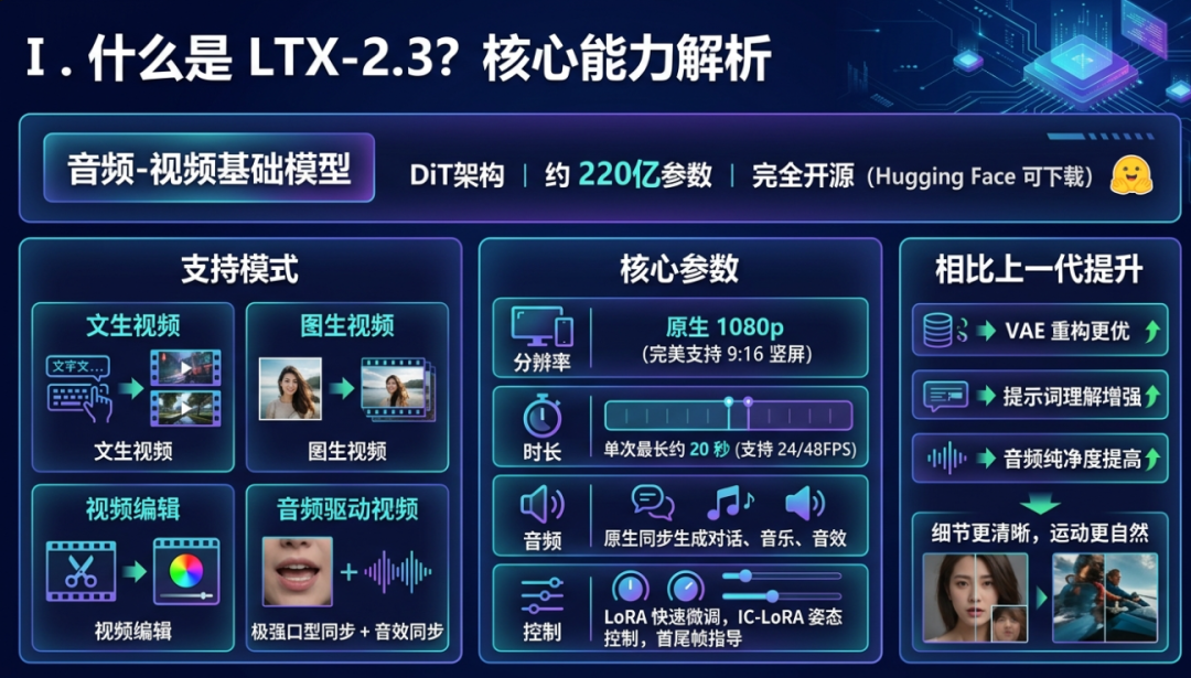 LTX-2.3是基于DiT架构的音频-视频基础模型,参数约22B,完全开源(Hugging Face可下)。