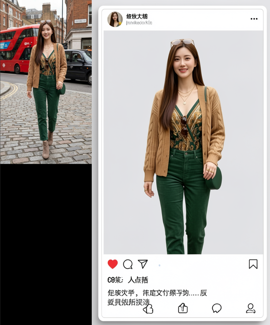 朋友圈风格・3D 弹出写真提示词。写实高清时尚上身照,人物:[角色描述 + 表情],身着:[详细服装]。画面为仿微信朋友圈界面,居中白色卡片框,背景柔和纯色:[背景色]。