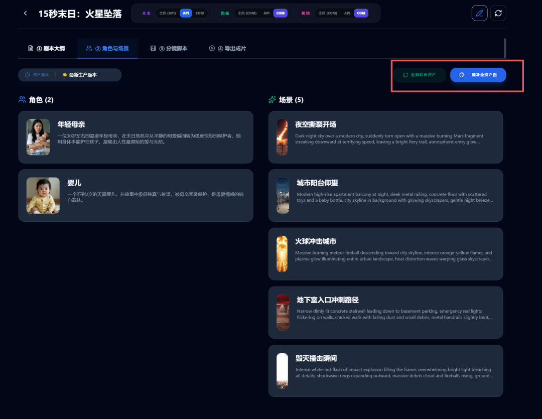 切换到角色与场景中,就会得到刚才在剧本大纲生成的结果,角色与场景的资产设计。