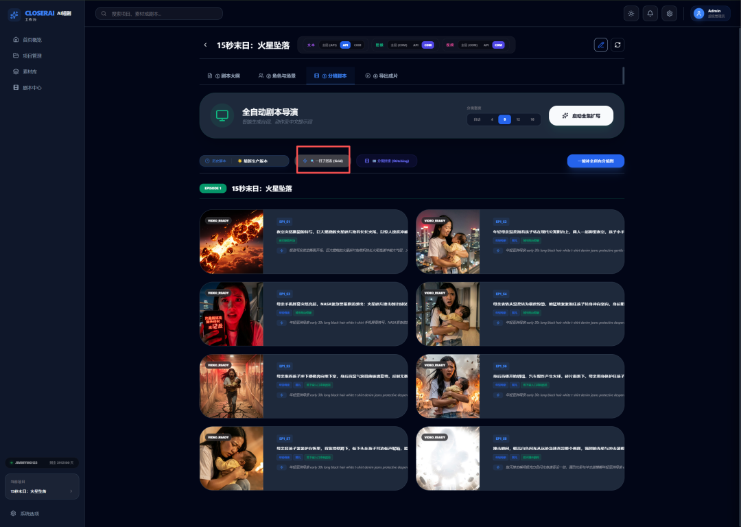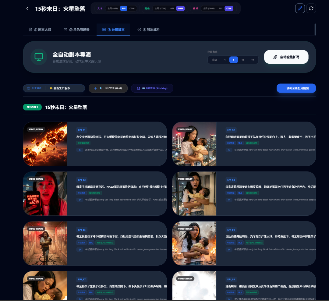 前面的Agent解决了总剧本,角色与场景的设计,分镜脚本就是要解决详细内容的问题。这里点击 启动全集扩写,这样就能基于第一第二步的内容进行分镜的扩写。