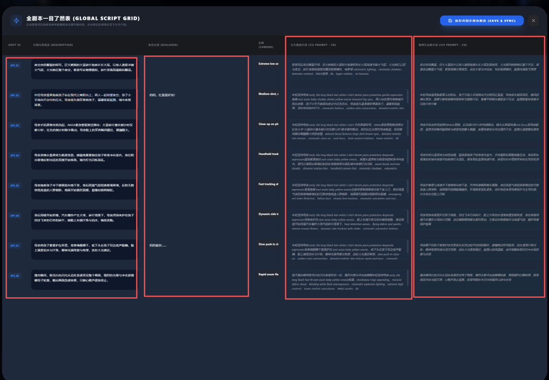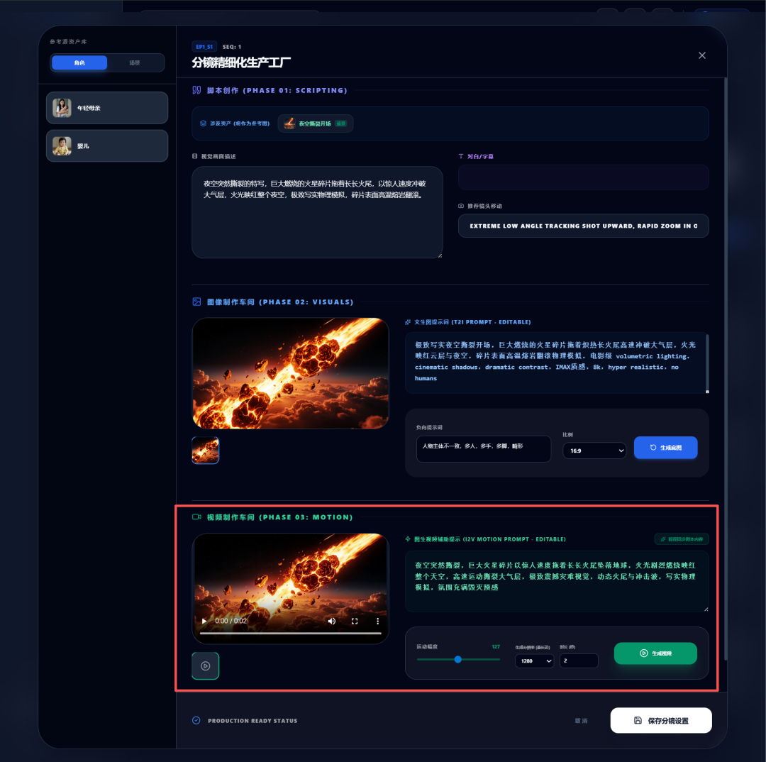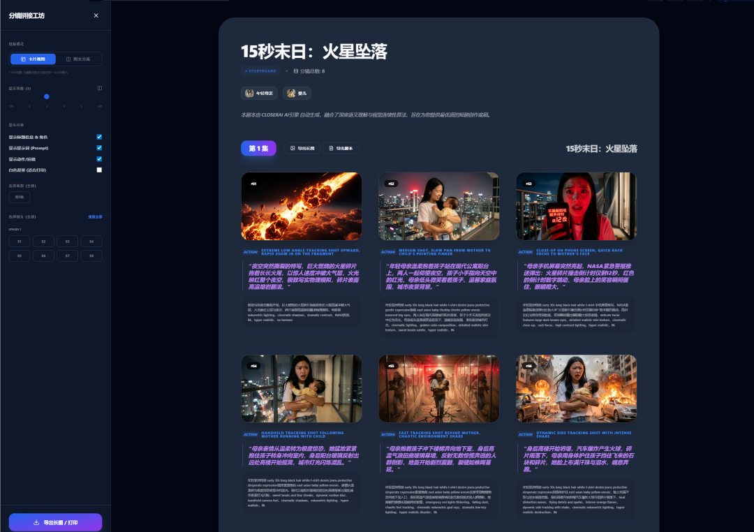 它会全自动将每个分镜的内容匹配上角色与场景,形成详细生图提示词与视频生成提示词的描述呈现出来。