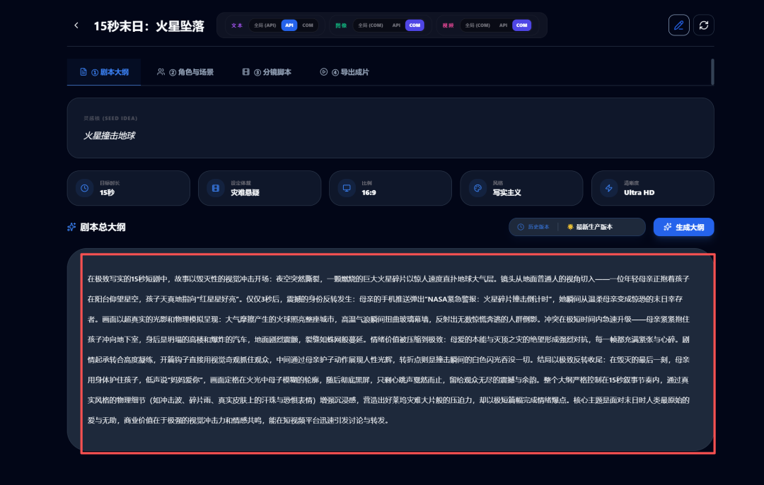 如我输入:火星撞击地球,灾难悬疑,15秒,写实风格,
