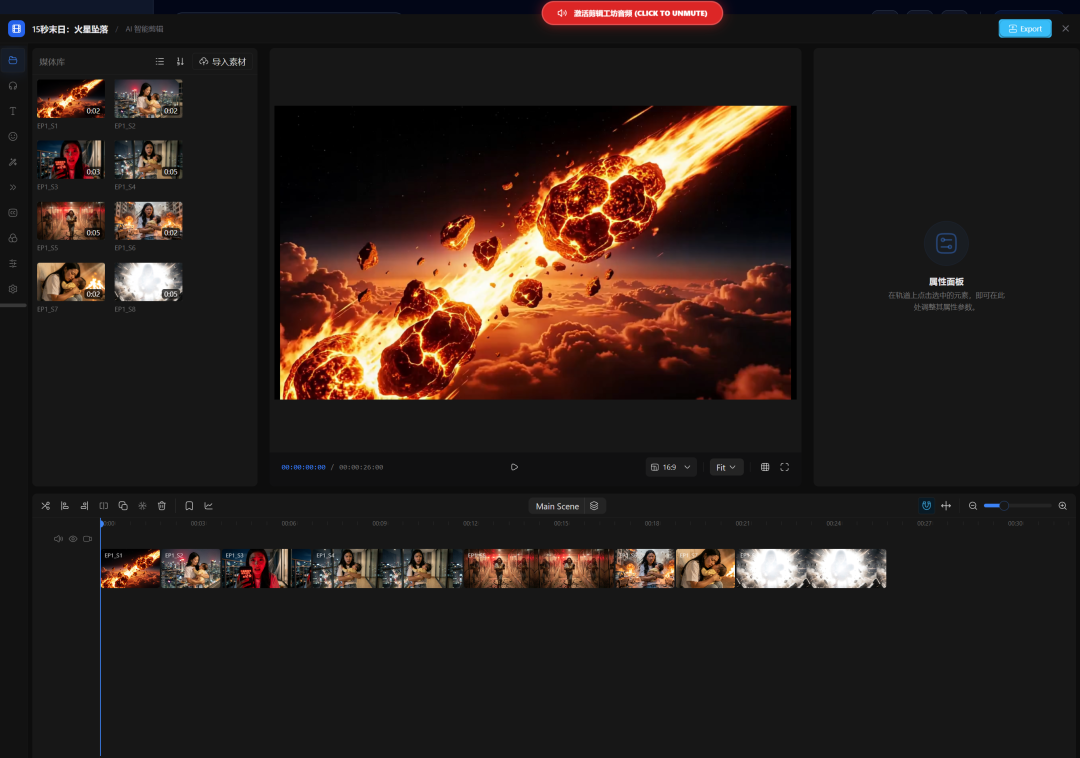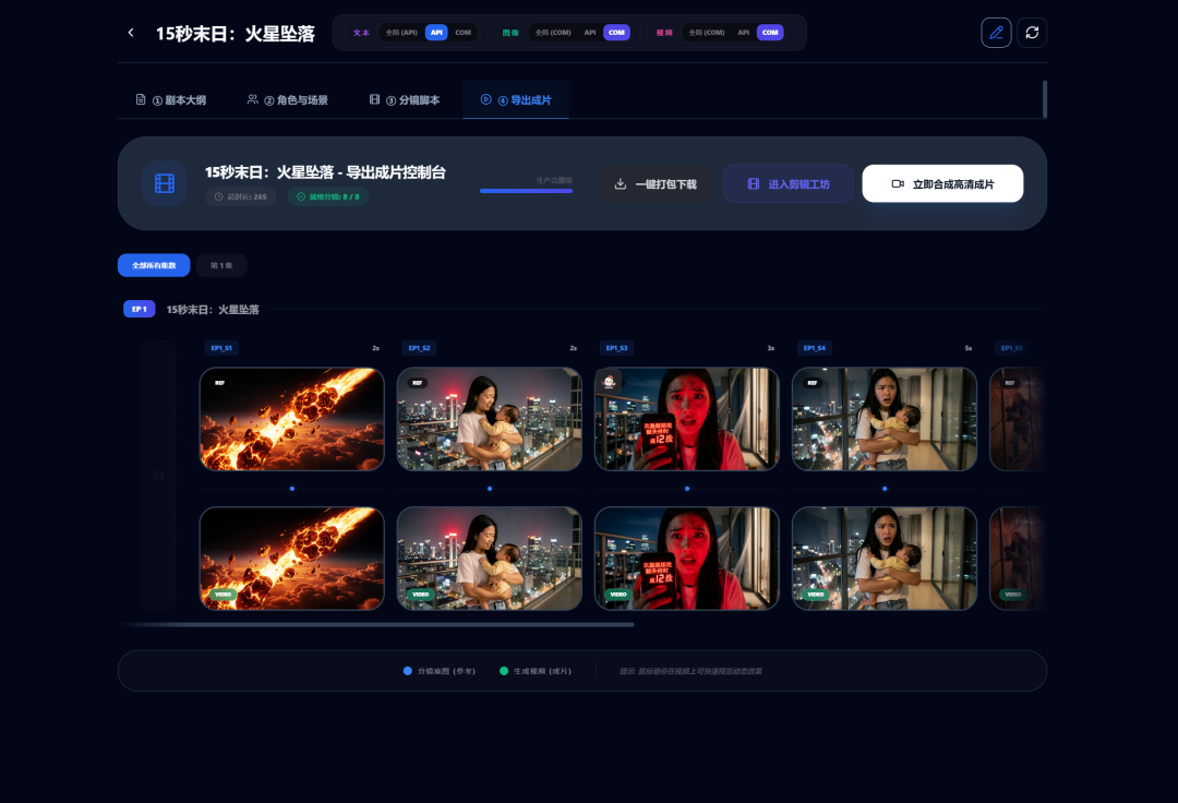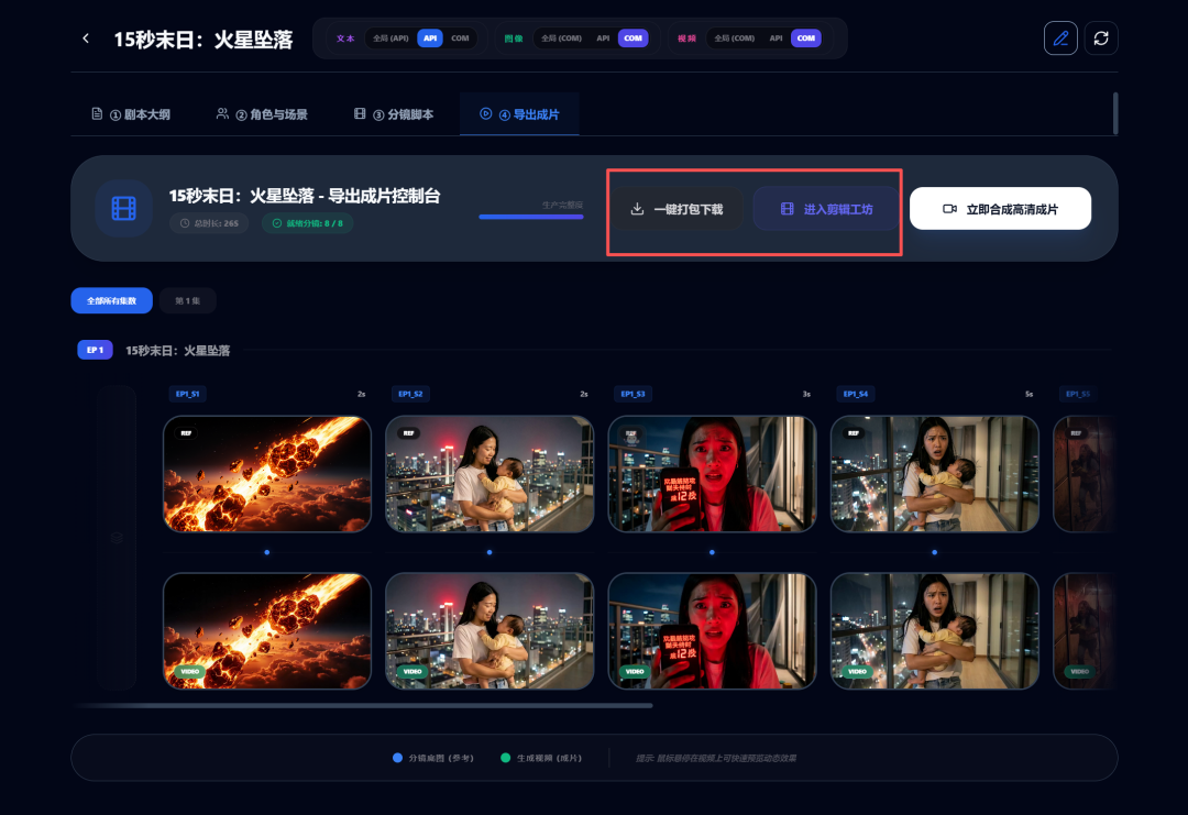 在这个模块生产完分镜图片与视频后,进入导出成片的模块。