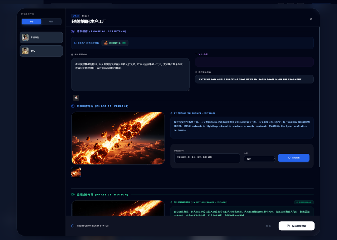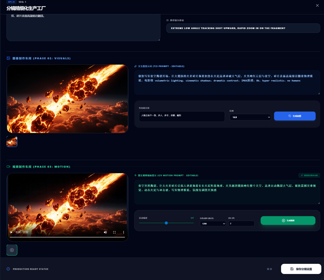 | 分镜导演 | StoryboardGenerator | 核心连接器。将编剧的文字转化为 AI 易懂的视觉语言,并建立资产匹配索引。 | T2I (文生图) 提示词、I2V (图生视频) 提示词、角色/场景关联索引。 |