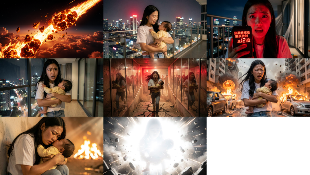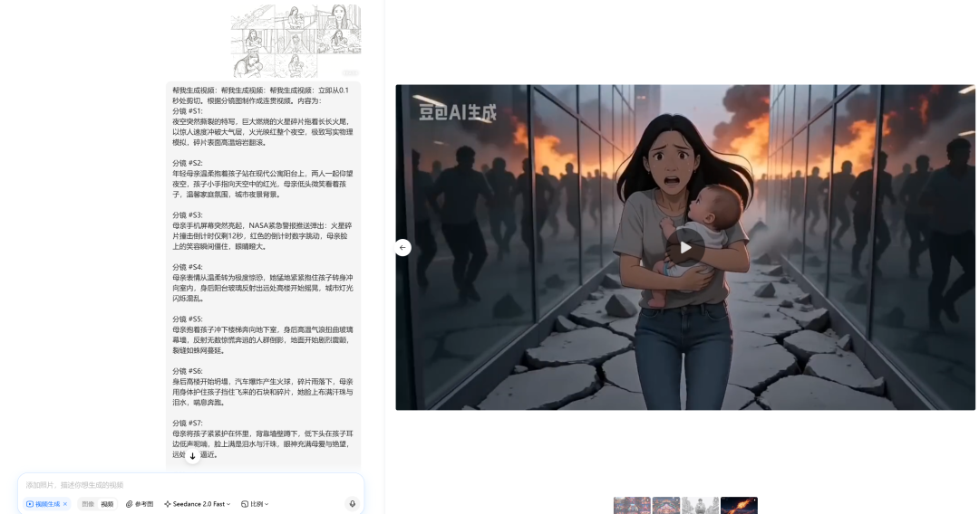 两种模式,图文分离就是最好的输出。如我输出了九宫格分镜图,然后在豆包使用seedance2.0进行视频生成: